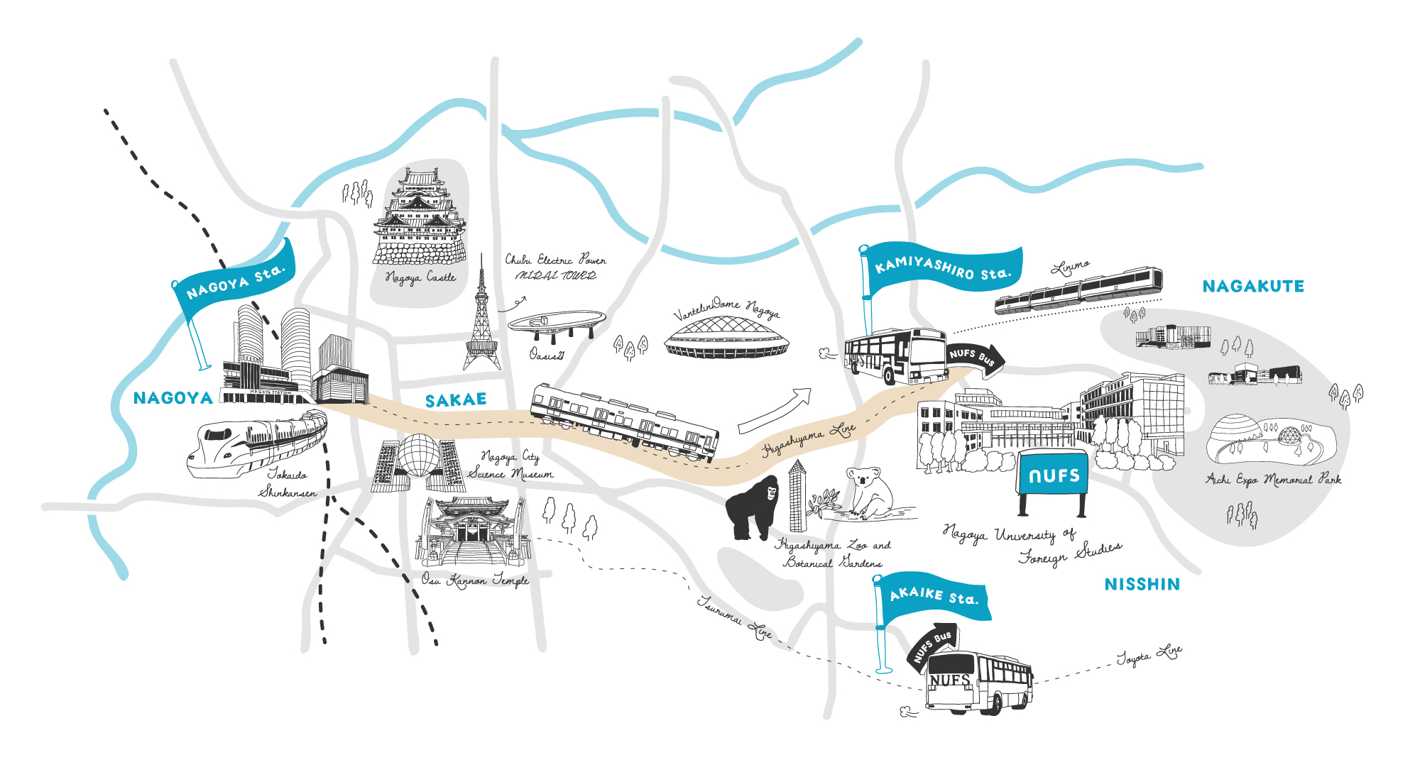 名古屋駅から日進キャンパスまでは、地下鉄と専用バスを利用して約45分です。