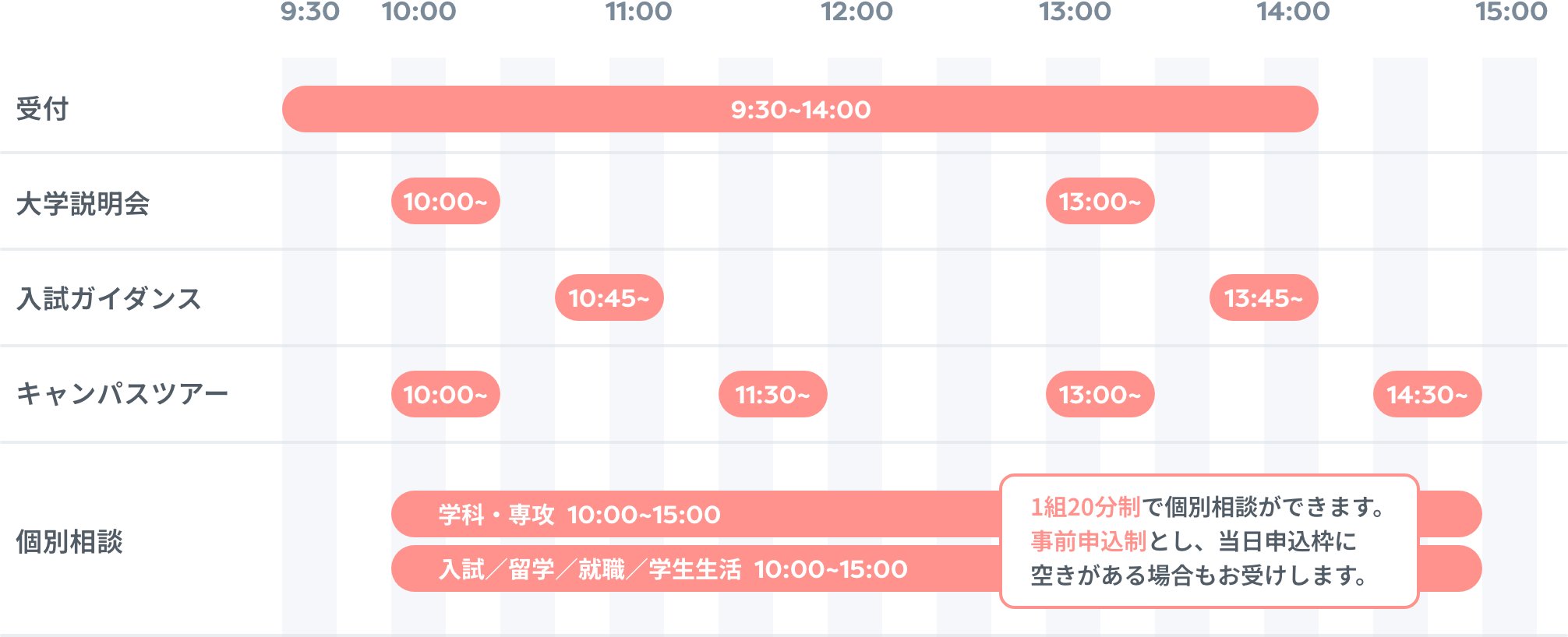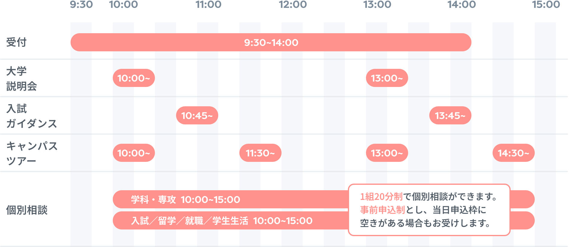 大学説明会、入試ガイダンス、キャンパスツアー、学科・専攻個別相談、各種個別相談の5つのプログラムをご用意しています。