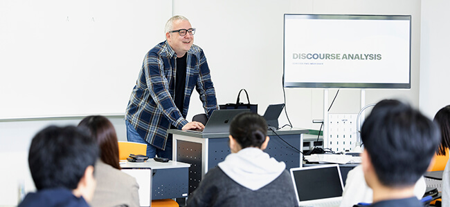 1年次はSNSや世界的なイベント・ニュースなど身近なトピックを題材に、英語文献の精読に必要な方法を理解し活用するための「Reading」と、学術的に英語でレポートを書く力を定着させるための「Writing」に取り組みます。2年次以降は核や人権、SDGs、児童労働など多文化共生を考える上で重要なトピックについて論理的に伝え、アカデミックな方法で他者を説得するための力を「Debate」や「Presentation」を通して身につけます。自分とは異なる立場や価値観の人と協働しながら、自分の意見を積極的に発信し、コミュニケーションをとる力を養います。