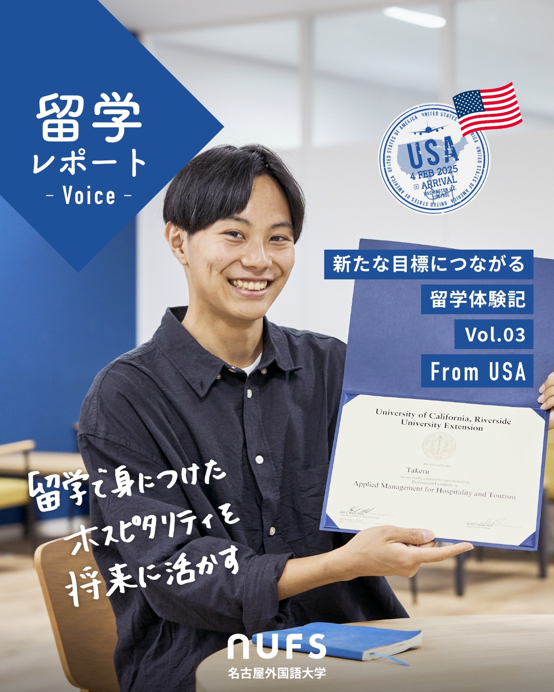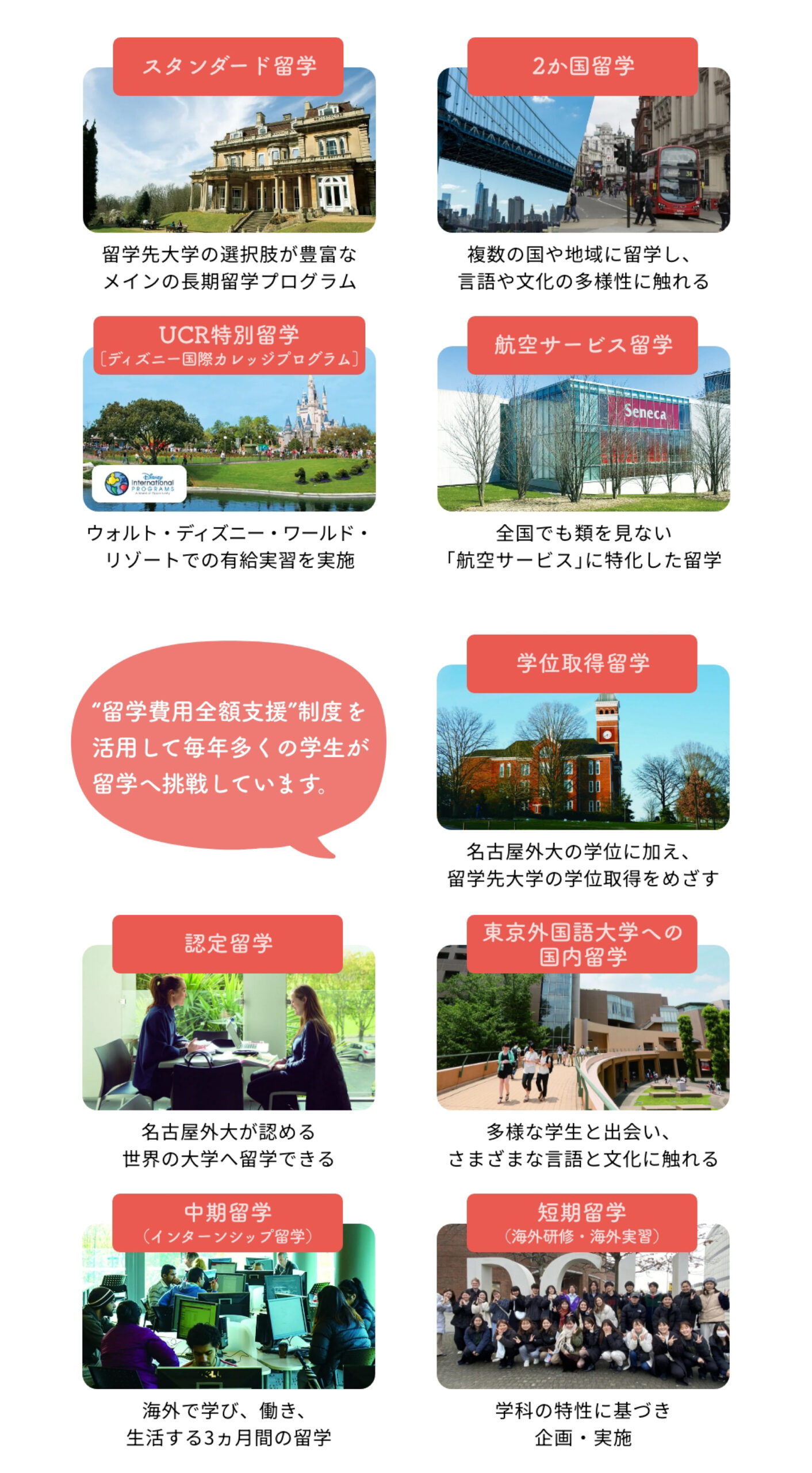 名古屋外大は留学への支援が手厚く、特長的なのが“留学費用全額支援”制度です。語学試験やGPAの基準を満たす学生に「留学先授業料」「航空券」「居住費」「保険料」などの費用を全額支援しています。そのため、経済的な負担を最小限に抑えて、留学に挑戦することができます。