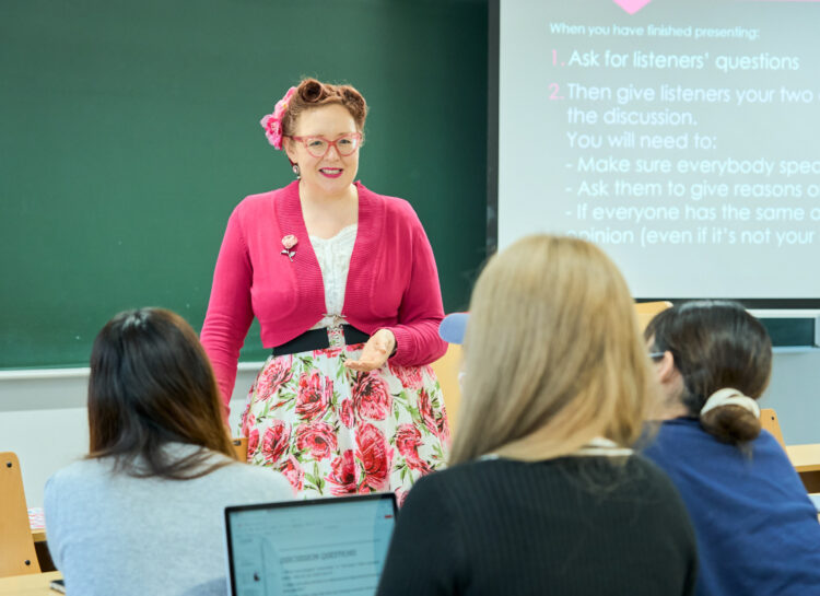 英語力だけでなく、明確な根拠に基づいて論理的に自分の意見を発信する力を身につけてほしいと考えています。ポップカルチャーに潜む性差別や人種差別といった社会問題に気づき、それを自分の言葉で表現できるようになることが重要です。